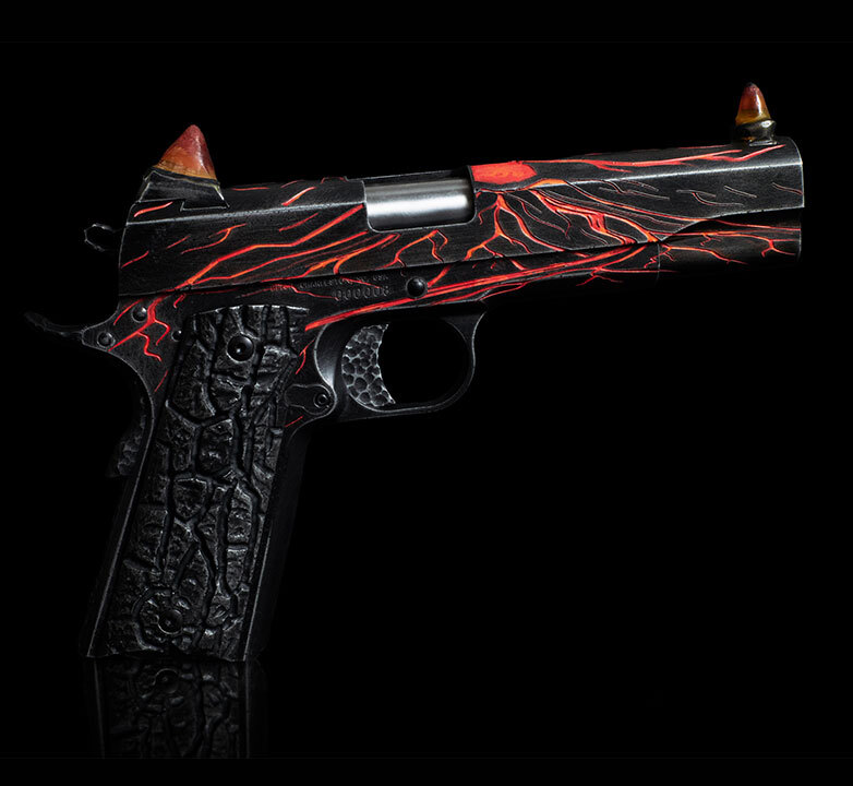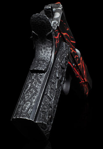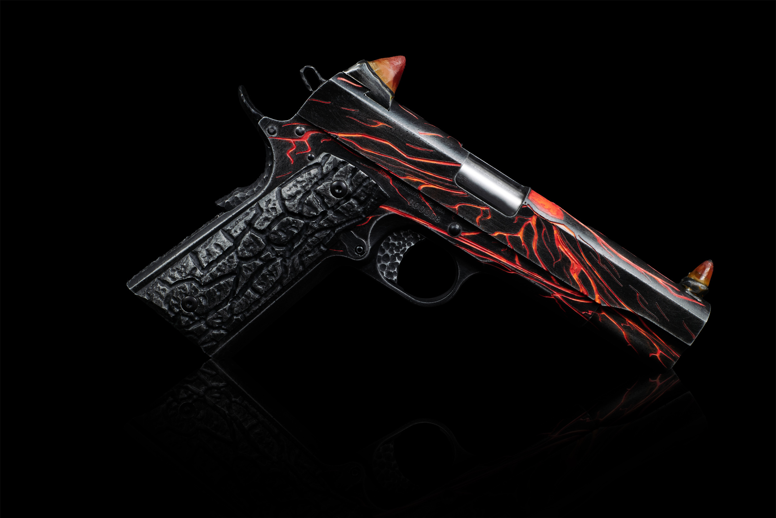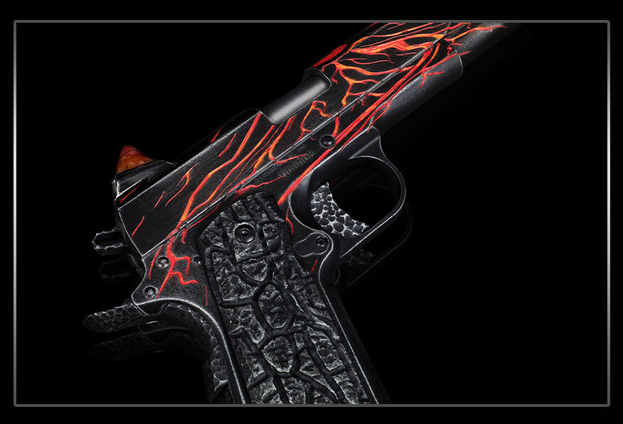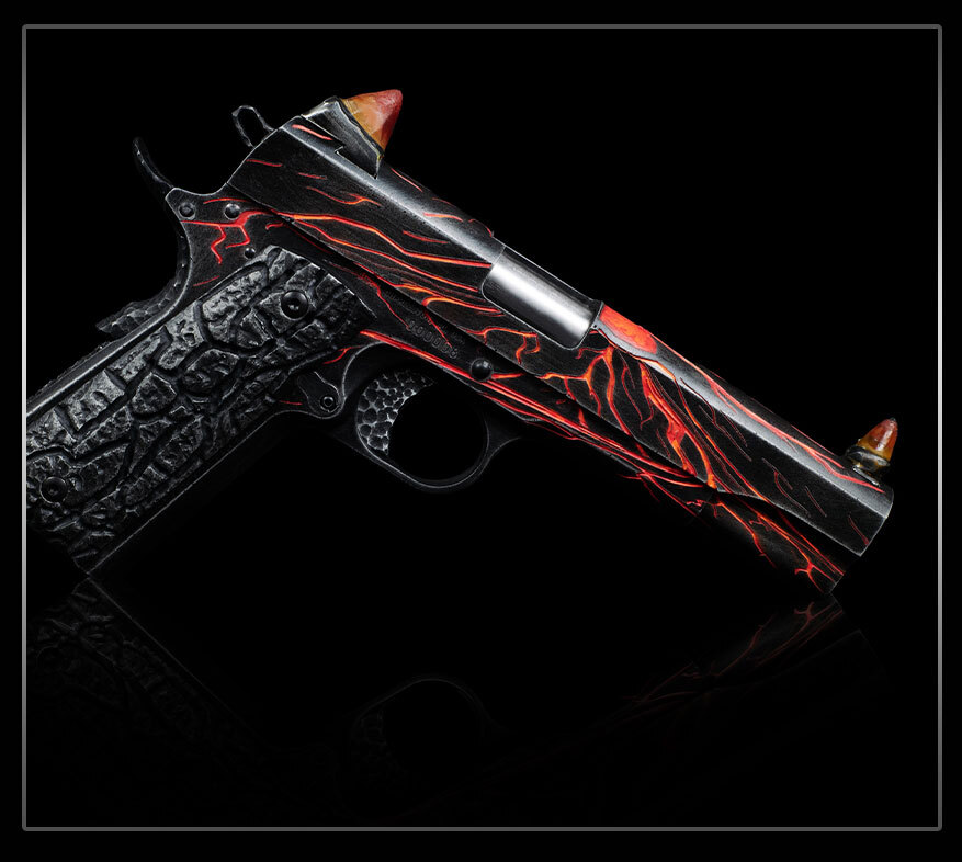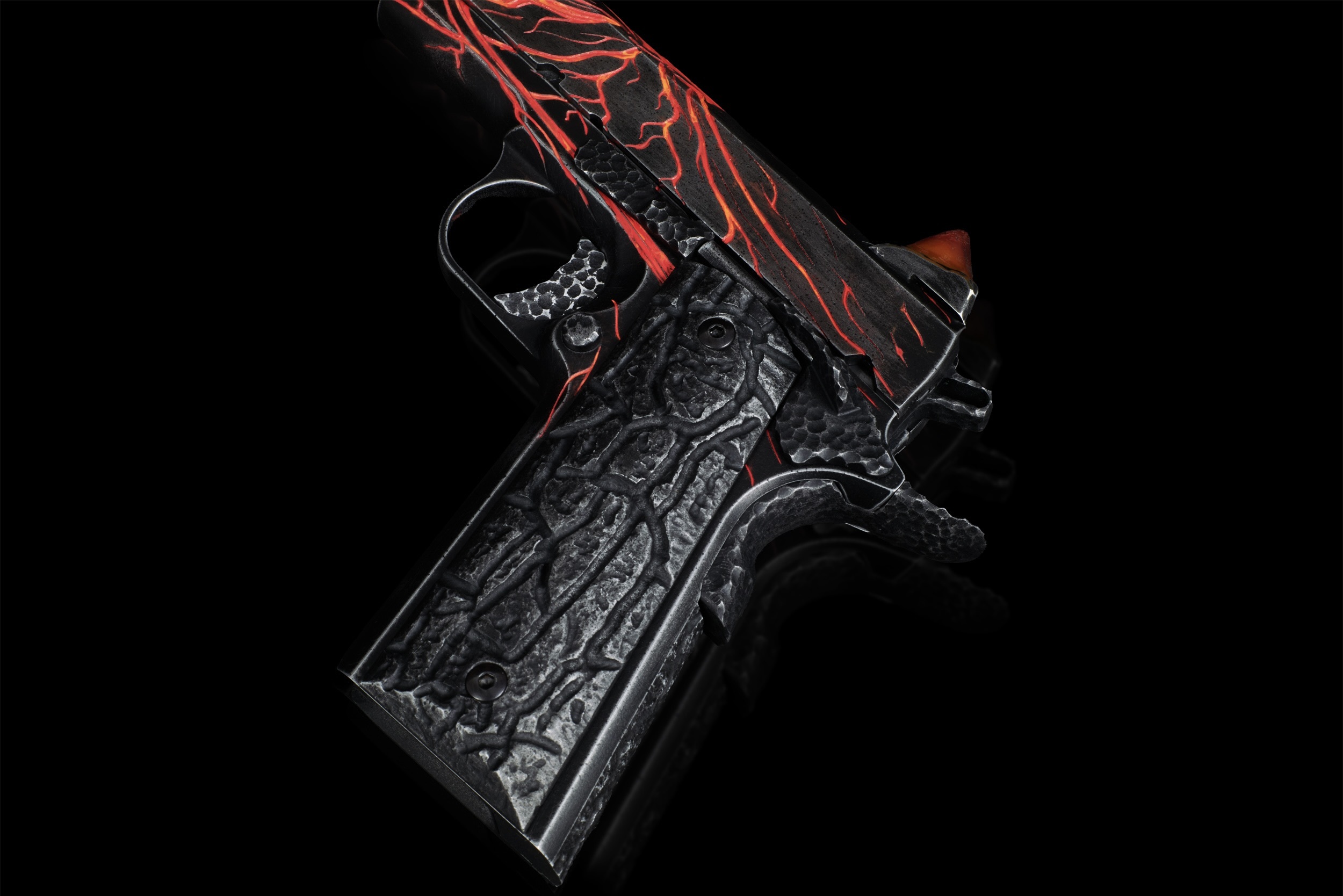 The Lava Gun is a full-carbon 1911 born from the idea that a firearm can look as if it clawed its way out of the earth’s core. Every contour, every engraving, every shadowed groove glows with the violence, heat, and pressure of a world beneath our feet. This isn’t a tribute to a volcano. it is the eruption itself, captured in steel.