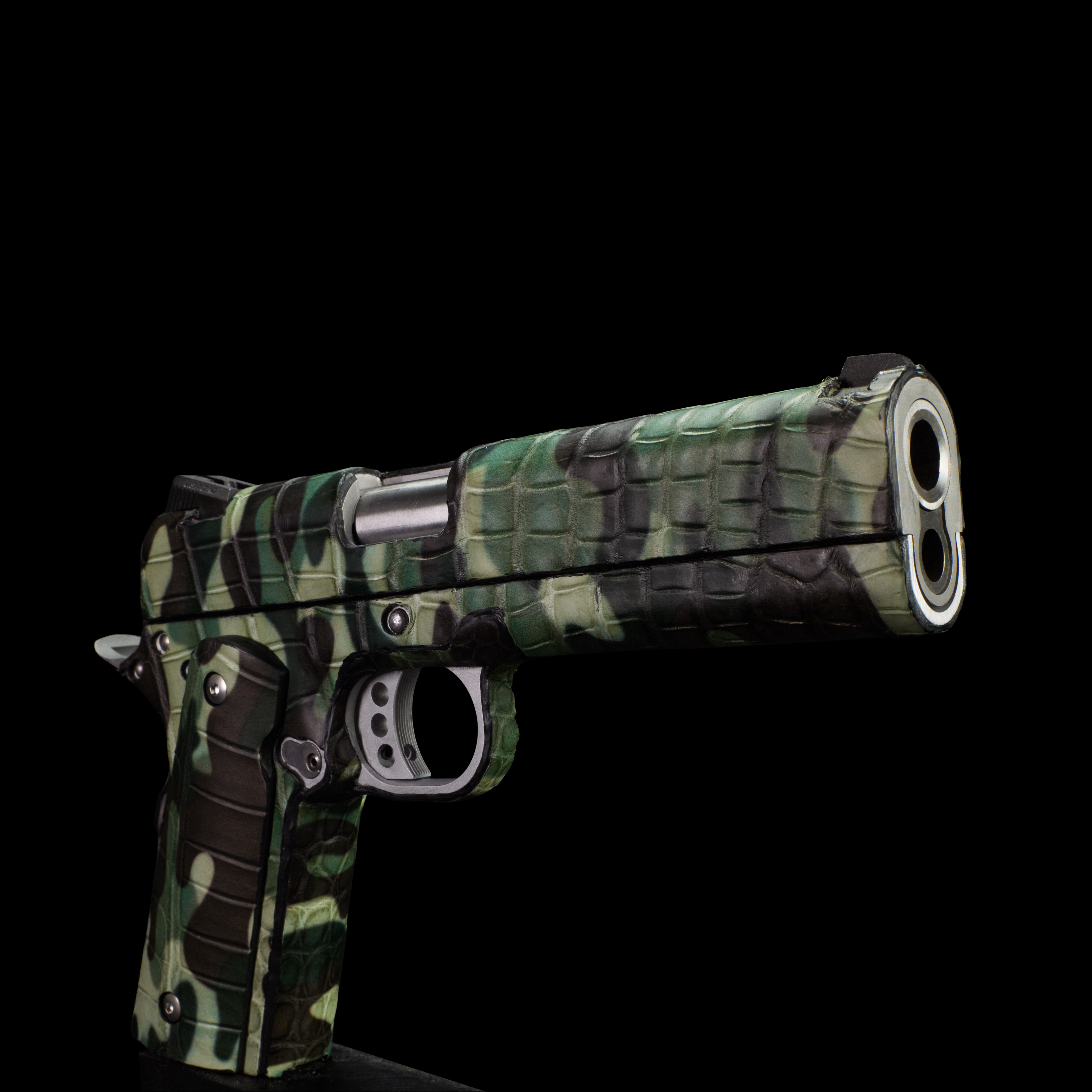 The Camo Croc isn’t just a firearm—it’s a legacy. Each pistol is wrapped in real caiman crocodile leather, showcasing