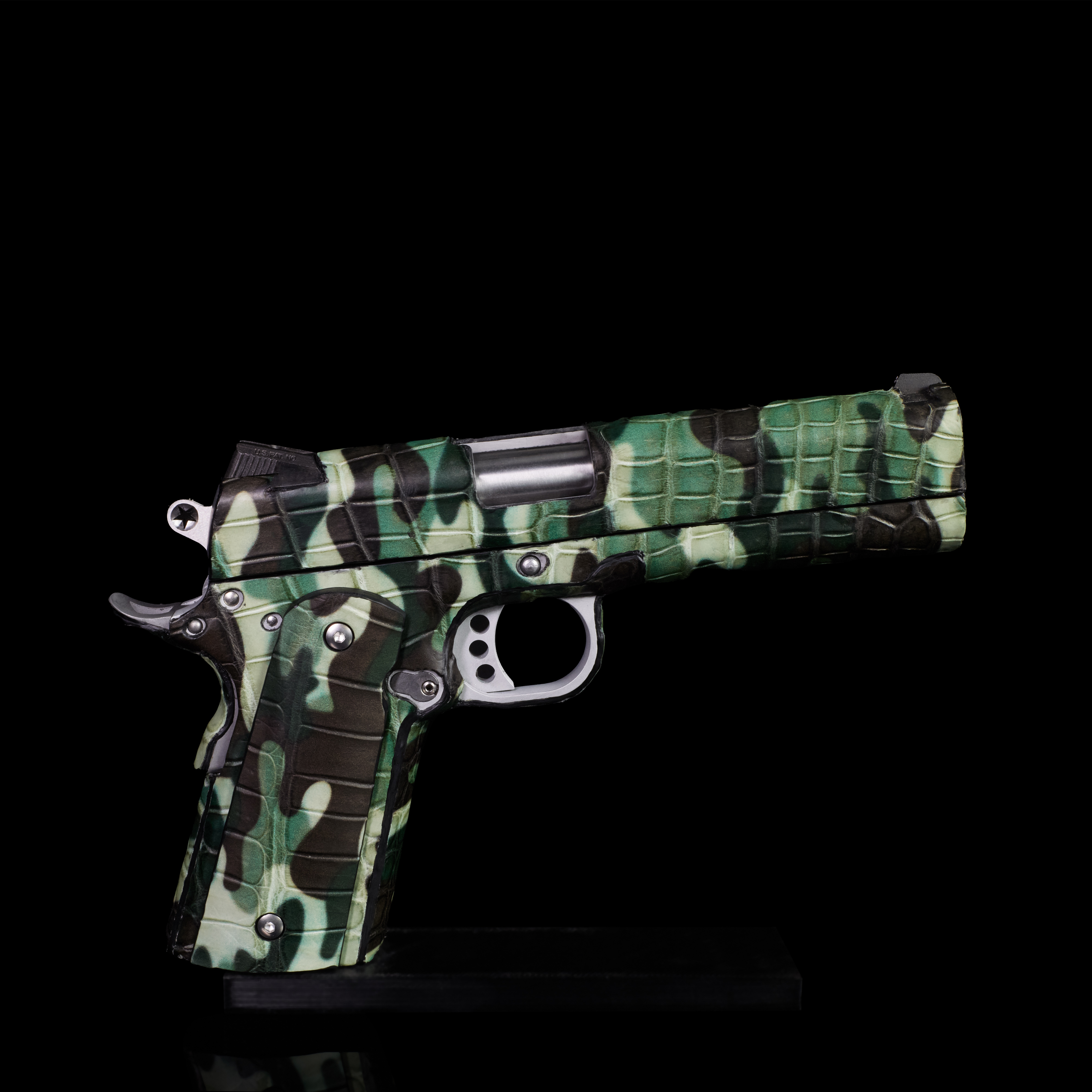 The Camo Croc isn’t just a firearm—it’s a legacy. Each pistol is wrapped in real caiman crocodile leather, showcasing